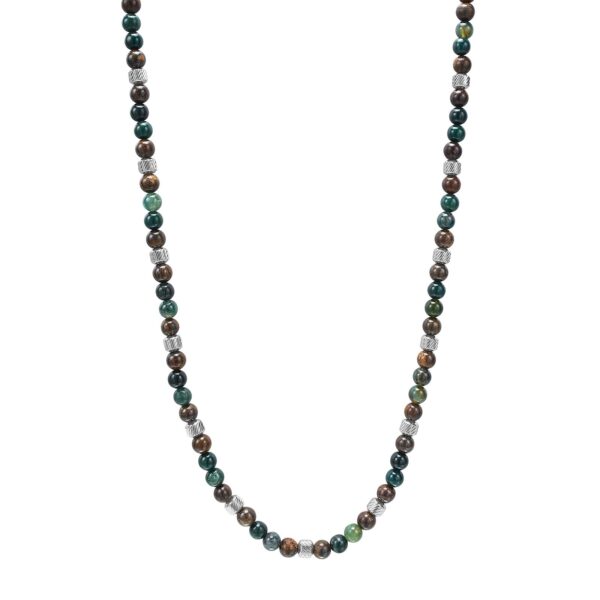 SON kæde stål med moss agate/ilmenite bronzitite 6mm fra Son of Noa er skabt til manden, der vil udtrykke styrke, stil og autenticitet uden at sige for meget. Kombinationen af køligt stål og ægte natursten giver et råt, men sofistikeret udtryk, der passer perfekt til både hverdag og mere formelle anledninger. Hver perle er unik, hvilket gør halskæden personlig og karakterfuld. Med sin længde på ca. 50 + 5 cm falder den flot over kraven og fuldender dit look med diskret selvsikkerhed.