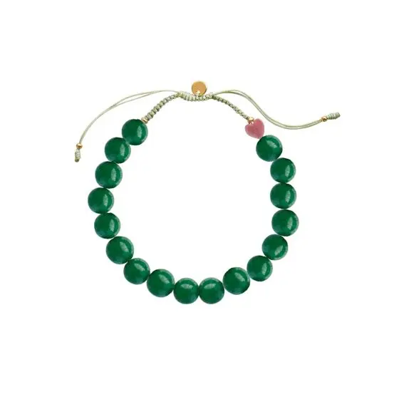 Stine A Armbånd Cherie Bon Bon – Happy Green er et smykke, der øjeblikkeligt tilføjer personlighed og let luksus til dit look. Det håndknudlede armbånd er udført i 18 karat forgyldt 925 sterlingsølv og prydet med grøn jade, der symboliserer balance, glæde og fornyelse. Ingen sten er ens, hvilket gør dit armbånd helt unikt og skabt specielt til dig.