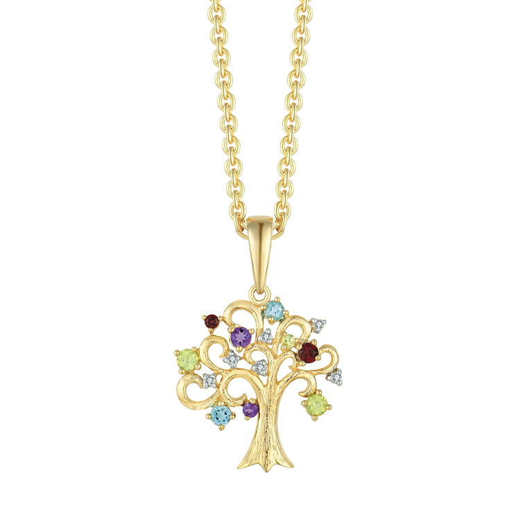 Smuk halskæde i 8 kt. ægte guld med Livets Træ med peridot, blå topas, amertyst, granat og syntetiske cubic zirconia.