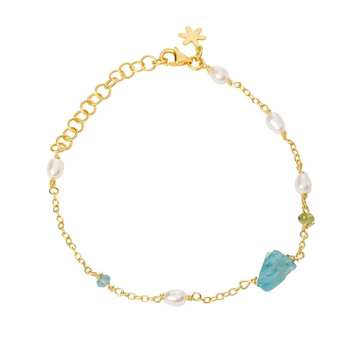 Smukt armbånd i forgyldt med blå sten, en enkelt grøn sten og perler.
