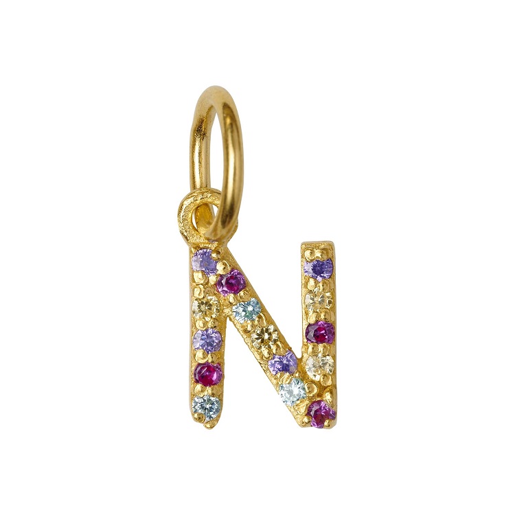 Susanne Friis Bjørner Bogstav N er et elegant vedhæng i forgyldt 925 sterling sølv, skabt til at bære din historie tæt på hjertet. De multifarvede zirkoner fanger lyset smukt og giver et eksklusivt, feminint udtryk, der gør smykket til en oplagt gave med personlig betydning.