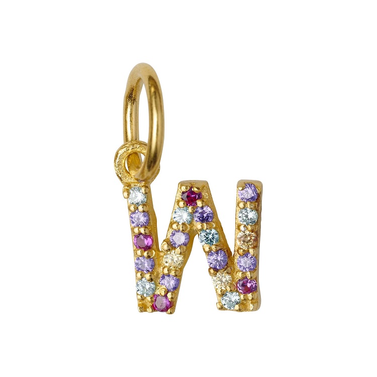 Susanne Friis Bjørner Bogstav W er et elegant forgyldt vedhæng i 925 sterling sølv, skabt til dig, der vil bære noget personligt – hver dag. De multifarvede zirkonia-stene fanger lyset og giver et feminint, legende touch. Perfekt som gave med tanke og mening, eller som en forkælelse til dig selv.