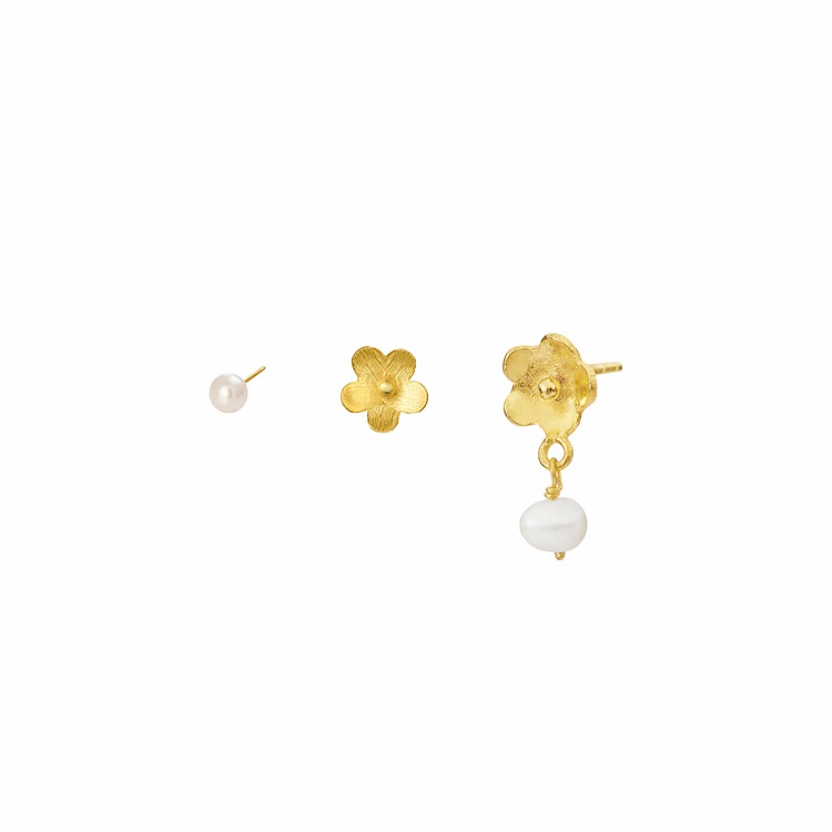 Smukke øreringe i forgyldt, sæt med 3 enkelte øreringe med perler.